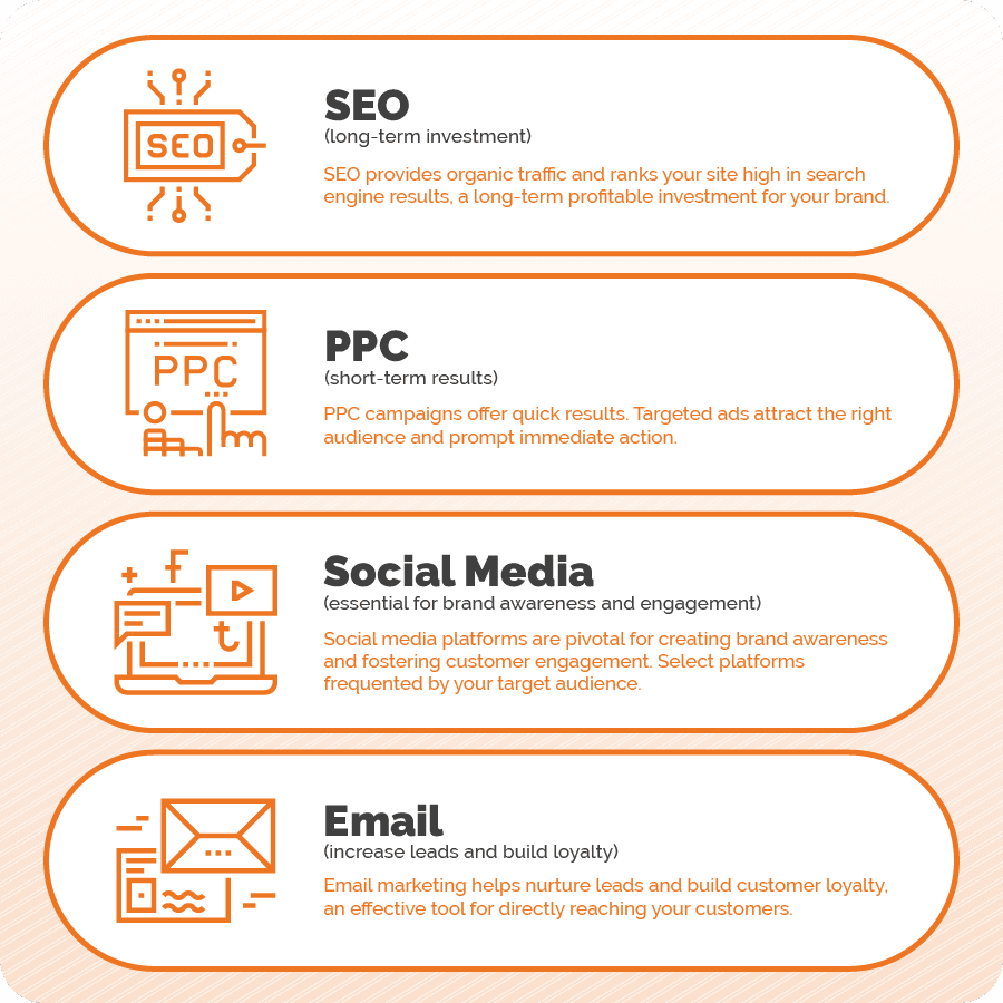 Select digital marketing channels that best reach your audience. SEO, Social Media, Email, and PPC are key channels to consider.