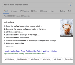When it comes to click-through rates, featured snippets that incorporate a high-quality image are even more effective. However, Google doesn’t allow you to choose and tag the image you want featured, so if your site is selected by the algorithm, Google will choose the best-suited image from your site for you. To prepare for this random selection, make sure all the images within your site are high-quality, branded, and include annotations.
