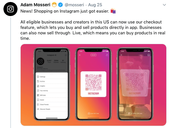 According to a tweet from Instagram CEO, Adam Mosseri, all eligible U.S. merchants can now take advantage of checkout on Instagram.